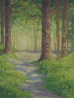 "Grasmere Path, The Lake District, England" 8x6" oil on canvasboard- We walked this path around Grasmere, one of the lovely small lakes in Cumbria, some years ago and I loved the soft dappled sun coming through the trees on a late summer afternoon.